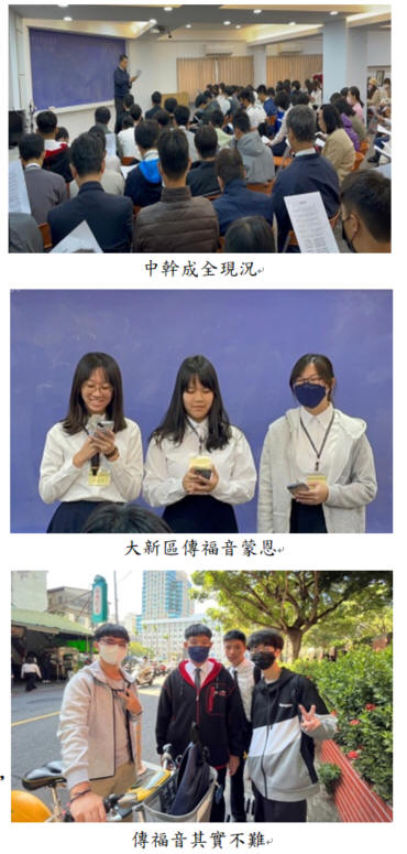 首頁 > 職事信息 > 申言主題 > 全地開展、牧養材料 > 聖經學習單 > 讀經拾穗 > 結晶圖表 > 水流交通 > 專項報導 > 召會生活 > 報告事項 > 禱告事項 > 召會生活人數 專項報導 二〇二三年青少年冬季中幹成全蒙恩報導 為了豫備青少年作轉移時代的人,本學期最後一次中幹成全暨服事者交通聚會,延續前次負擔,藉着聖經榜樣讓青少年決志奉獻作轉移時代的人,並加強服事者的異象,率先操練成為榜樣。此次成全共有六十五位青少年,五十七位家長與服事者參與,下半年與會的人數相比以往更多,看出聖徒們都更有受成全的心志。 此次成全主題為「信心的榜樣-勝過墮落世代的但以理」,眾人學習但以理的榜樣,與同伴一同獻上自己,勝過墮落世代的潮流。 聚會中,弟兄們成全青少年唱詩歌,進入詩歌的靈。許多人在唱詩中向主宣告:「靠恩,無論如何艱難,我要求你喜歡」;也有人更新奉獻:「哦主,求你悅納我心,上好之愛,來愛你。」詩歌的靈一出來,信息的負擔就使人更容易接受,自願奉獻讓神用來轉移這個時代。 後段分為青少年成全與服事者交通,青少年彼此見證福音出訪、校園排經營蒙恩。同伴之間得着激勵,相約要為着福音繼續出訪,並不可放棄自己的聚集,操練每次聚集「各人或有」,好叫召會得着建造。 服事者交通則藉着翟弟兄的幫助,加強主日聚會以及經營夜間擘餅聚會的負擔。目的是要竭力幫助青少年分別主日,不是為了人數,而是使青少年得復興,在這一天裏有段時間留在主面前禱告,好好聚一個正式的聚會,而有真實屬靈的新鮮。以下為本次青少年福音出訪的蒙恩精選: 這是我第一次在校門口傳福音,一開始我有些排斥,因為我不喜歡跟陌生人搭話,裏面常常會因懼怕而不敢傳。但是服事者邀約我,我便跟着服事者在校門口向人傳「人生的奧祕」。 我們遇到一位同學,他不僅聽完我們的傳講,最後也跟着我一起禱告。當下我感到驚訝,卻也非常喜樂,這次的經歷十分加強我,使我突破自己,認識在學校傳裏福音不是不可能的。 隔一週因着服事者不在,我雖然知道要傳,卻還是沒有去。主就用聖經的話題醒我:以斯帖把握她王后的位分為神的子民說話。信息中說到,以斯帖是一個熱愛神、不會因環境而遺忘神和祂子民的女子;她不顧自己的得失,不論結果如何,她願意為着神的旨意拚上自己。看到她的榜樣後,我覺得我在傳福音的事上還不彀迫切,求主使我能彀放膽在校園裏為祂傳揚福音。 (新民高中/林宇澤) 藉着堅定持續的傳福音,主就引導我邀請一位同學參加福音聚會。福音聚會前,我每天和校園裏的同伴為同學們禱告,沒想到她就簡單的答應。福音聚會結束後,同學也很敞開,答應一同讀經追求,也主動說想去校園排。感謝主! (文華高中/蔡昕涔) 我很寶貝在傳福音的操練中,更多經歷主向我們說話和引導,也更加多在我們裏面。無論是在小區、還是在學校,我需要更多為眾人禱告,讓更多人聽見福音! (明道高中/許念竹) ![]() 這次的見證及研討分為幾個方面:送會到家、福音開拓接觸、小五六銜接、以及開排。所有的見證有幾個共通點:首先就是禱告,為着聖徒能有負擔禱告,為着新手媽媽的情形禱告,為着兒童的屬靈生活禱告,為着兒童家能打開家禱告。這需要我們彼此作活力伴,不只聚會來在一起,生活中也時常關心彼此代禱,形成活力排。藉着禱告,就將負擔作到聖徒的裏面,讓主來開路。 本次台中市召會在報名邀約上,看見許多召會共乘遊覽車共同前往,我們看榜樣也學榜樣,訂一台遊覽車,目標四十位聖徒。聚會當天,約有六十位聖徒報名,並且遊覽車滿座,比起已往只有全時間同工參加,在報名人數上繁增數倍。因此,有更多聖徒進入全台的交通,直接領受兒童是個大的福音的異象和負擔,並看見各地的見證和實行。結果,有二十六位聖徒填寫開家開排心願單,有分打開家並開拓兒童排的服事,盼望帶進下半年兒童排的開拓,實現兒童是個大的福音。 邀請弟兄姊妹加入並分享以下資源 >台中市召會網站(官網含完整資訊) http://www.citc.org.tw/ >台中市召會聖徒交通(社群) http://bit.ly/2TIYeVX >台中市召會網路資訊中心 Youtube頻道 https://bit.ly/3s2y9Sr >台中市召會科園會所 Youtube頻道 https://bit.ly/3ysUECj >水深之處 http://www.luke54.org/ |
