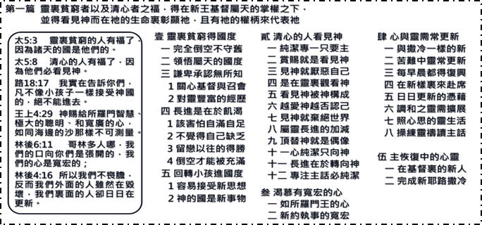 首頁 > 職事信息 > 申言主題 > 全地開展、牧養材料 > 聖經學習單 > 讀經拾穗 > 結晶圖表 > 水流交通 > 專項報導 > 召會生活 > 報告事項 > 禱告事項 > 召會生活人數 結晶圖表 國度之子是靈裏貧窮倒空,清心愛慕看見神的人;他們的靈常更新並且心寬宏,至終會成為新造的新人。 (建議看此圖時手機橫拿觀看)聖經學習單答案: 1、瑪各地、歌革; 2、榮耀、審判; 3、他們的罪孽、掩面不顧。 邀請弟兄姊妹加入並分享以下資源 >台中市召會網站(官網含完整資訊) http://www.citc.org.tw/ >台中市召會聖徒交通(社群) http://bit.ly/2TIYeVX >台中市召會網路資訊中心 Youtube頻道 https://bit.ly/3s2y9Sr >台中市召會科園會所 Youtube頻道 https://bit.ly/3ysUECj >水深之處 http://www.luke54.org/ |