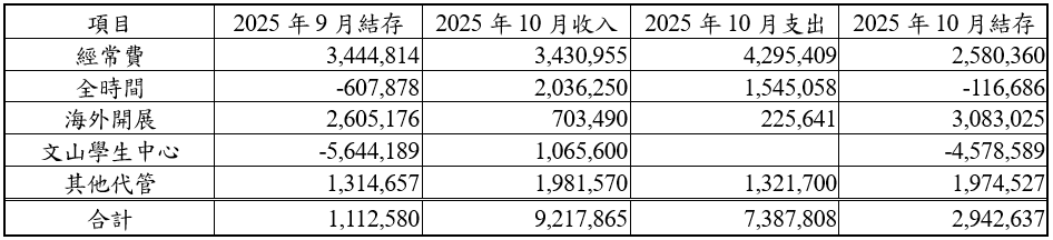 首頁 > 職事信息 > 申言主題 > 全地開展、牧養材料 > 聖經學習單 > 讀經拾穗 > 結晶圖表 > 水流交通 > 專項報導 > 召會生活 > 報告事項 > 禱告事項 > 召會生活人數 報告事項 一、(11/24~11/30)真理追求進度: 1、生命讀經追求進度:以弗所書生命讀經第三十七至三十八篇。 2、李常受文集追求進度:一九七二年第三冊「聖經中最大的豫言及其應驗」第五至八章及「為着實際、真正、真實的召會生活享受基督作包羅萬有的靈」第一至三章。 二、二〇二五年感恩節特會: 感恩節國際相調特會將於11/27(四)至11/30(日)在美國印第安納州印第安納波利斯市舉行,水流職事站題供特會信息現場直播,直播網址:conf.lsmwebcast.com。各篇信息日期及時間(台灣時間)如下,第一篇:11/28(五)8:30;第二篇:11/28(五)23:00;第三篇:11/29(六)8:30;第四篇:11/29(六)23:00;第五篇:11/30(日)8:30;第六篇:11/30(日)22:30。 三、二〇二六年一月台中市召會新興社區開展: 召會將於明年1/27(二)至2/1(主日)在台中市的十個照顧區有新興社區福音開展,誠摯邀請壯年班校友、壯年班現訓學員、週三得勝班弟兄姊妹報名,與社區聖徒一同配搭傳揚福音、牧養新人,使召會得繁增。報名請詳細填寫表單(https://forms.gle/4FqzqJQNdDUFusBV6),以利編組成軍。 四、二〇二五年當年度十月份收支狀況: ![]() 五、青少年組: 1、晨興進度:本週《聖經之旅》第十一冊第七課「神給召會的福分(一)父的揀選和豫定」。 2、得榮少年專案線上申請已經開始:「續申請件」自11/1(六)開始至11/30(主日)截止;「初申請件」自11/15(六)開始至12/15(一)截止。若有任何疑問,歡迎跟青少年組全時間聖徒有交通。 六、大專組: 大專期末特會將分為兩梯次進行,第一梯次時間為12/27(六)~12/29(一),地點於嘉義番路鄉;第二梯次時間為1/10(六)~1/12(一),地點於惠蓀林場。特會主題為「享受基督活而實際的路」,詳細資訊請參考連結:https://forms.gle/gbKPhatSoq2TZQCP6。 七、二〇二五年北、中、西各照顧區長青聖徒年終感恩相調聚會: 今天(11/23)【北各照顧區】下午3:30在豐原會所;【中各照顧區】下午4:00在復興大樓; 【西各照顧區】下午4:00在科園會所舉行。 各大區需安排一位聖徒題前一小時到場,配搭報到服事。愛筵菜量豫備以A4餐盤為準,每大區擺上主日基數十分之一盤數,葷素比率約2:1,中、西各照顧區請於下午5:00送達復興大樓及科園會所。 八、結婚聚會: 三十六大區陳薏帆姊妹(十三大區葉麗貞姊妹的女兒)與新北市召會劉成昕弟兄,訂於12/7(日)下午3:00在新北市召會永和會所(新北市永和區保生路24號地下一樓)舉行結婚聚會,因尚有未得救的家人,盼弟兄姊妹在愛裏代禱並前往扶持。結婚聚會報名連結:https://forms.gle/QHphXJ3tXCP6hBPq7。 九、書報組: 1、優惠活動:凡於11/1~11/30期間,至書報站購買中文書報享有七折優惠(POD書除外);禮品享九折優惠,歡迎至書報站選購。 2、全召會舊約讀經進度將進入「但以理書」和「小申言者書」。請以大區為單位,12/12(五)前回報「但以理」及「小申言者書」訂購數量,兩本合購原價240元,大區團體訂購優惠價160元。 邀請弟兄姊妹加入並分享以下資源 >台中市召會網站(官網含完整資訊) http://www.citc.org.tw/ >台中市召會聖徒交通(社群) http://bit.ly/2TIYeVX >台中市召會網路資訊中心 Youtube頻道 https://bit.ly/3s2y9Sr >台中市召會科園會所 Youtube頻道 https://bit.ly/3ysUECj >水深之處 http://www.luke54.org/ |