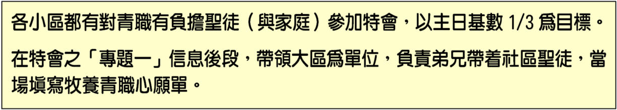 首頁 > 職事信息 > 申言主題 > 高峰真理 > 聖經學習單 > 讀經拾穗 > 結晶圖表 > 水流交通 > 專項報導 > 召會生活 > 報告事項 > 禱告事項 > 召會生活人數 水流交通 青職特會負擔交通-區區勤耕青職田 這次青職特會有一個重要的負擔,就是落實標語的第三句話:「區區勤耕青職田」。這句話是可以達到的,是非常令人喜樂的事。 ![]() 六年前我來到新北市板橋區,和弟兄們一同進入這個負擔,這些年來我們勤耕青職田,結果相當令人鼓舞。今年六月,在板橋區的六個會所,有六十九位青職追求生命讀經,超過青職基數的三分之一,加上陪伴追求的五十七位社區聖徒,共一百二十六位,天天出代價買真理。 海山大區還有七個會所,雖然青職人數只有二十八位,卻有四十二位聖徒下定決心要得青年人,陪伴青年人。他們天天陪伴青職,供應他們,扶持他們追求主話。最令我感動的是,他們不是等到有了青職纔有負擔,而是有負擔,先站出來,相信神的話。這六年的實行給我們一個寶貴的心得;青職的繁增與成全,是由社區領頭,帶着青職調出來的結果。 我們都希望青職有託付感、有決心,能承接託付。但是別忘了,他們需要背後有常時的供應、陪伴、帶領,最終他們就會像我們所期望的,自然的承接託付。因此這次我們不僅鼓勵青職參加,更希望各小區推動聖徒們前來參加。為甚麼呢?因為我們要一起接受負擔,回去勤耕青職田。 ![]() 說到青職服事,有兩個重點:第一,一定要有牧養對象,要有量,有足彀的數量。第二,有了量之後,就需要注意質的拔高,使他們將來能承接託付。這次,盼望各小區都有許多對青職有負擔的聖徒與家庭報名;人數以主日基數的三分之一為目標,如果有二十四人的主日,盼望有八位社區聖徒前來參加。 這次在「專題一」的後段,將以大區為單位,負責弟兄帶着社區聖徒,當場填寫牧養青職心願單。讓我們在喜樂的靈裏編組成軍,成為青職最強的後盾,使他們喜樂安息,得着加力。特會的後續是:在年底前,各小區青職家聚會的人數,能彀達到主日基數的三分之一。以二十四人主日為例,盼望每週青職家聚會為八位,聖徒們一人陪一人。 那麼你會問:「對象從那裏來呢?」可以從自己家人、聖徒與福音朋友開始。有人問說,「有了牧養對象,但我不知道用甚麼材料,怎麼家聚會呢?」我們考量的是,第一,材料需有完整的內容。第二,時間不要太長,一次約十分鐘就可以了。因此,我們採用福音書房的牧養材料,整理成精簡版,把每一課分成兩次來進入。每一次的內容都是完整的,有主的話可以禱告享受,有職事信息可以同讀,有一節的詩歌,或是一首的副歌,齊唱享受。最後為着彼此的健康、工作、與家人題名代禱。這樣,短短十分鐘,就完成一次美妙的家聚會。 盼望主大大使用這次機會,激動許多對青職有負擔的聖徒們,進入交通,齊心牧養。區區勤耕青職田,區區留青職,區區年輕化!(翟兆義) ![]() 邀請弟兄姊妹加入並分享以下資源 >台中市召會網站(官網含完整資訊) http://www.citc.org.tw/ >台中市召會聖徒交通(社群) http://bit.ly/2TIYeVX >台中市召會網路資訊中心 Youtube頻道 https://bit.ly/3s2y9Sr >台中市召會科園會所 Youtube頻道 https://bit.ly/3ysUECj >水深之處 http://www.luke54.org/ |