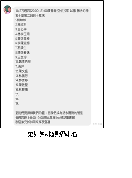 首頁 > 職事信息 > 申言主題 > 全地開展、牧養材料 > 聖經學習單 > 讀經拾穗 > 結晶圖表 > 水流交通 > 專項報導 > 召會生活 > 報告事項 > 禱告事項 > 召會生活人數 召會生活 西二照顧區 二十一大區 藉追求書報被聖靈充滿 二十一大區聖徒從二〇二一年八月二十六日開始,每週四晚上八點到九點用Line一同追求屬靈書報。至今已經超過一年,每次都有十多位弟兄姊妹上線。我們操練用靈讀,一個小時下來,常被聖靈充滿。我們要分享其中所讀過的書報: ![]() 《宇宙的奧祕與人生的意義》說到神鋪張諸天,建立地基,乃是為着人。惟有人是照着神的形像和樣式造的。因此,人生存的意義,乃是為着作神的器皿,彰顯神。 《如何享受神及操練》教導我們,必須天天操練運用我們的靈來呼吸神,把聖經的話當作食物喫了,好使我們在生命中長大,作一個正確的基督徒。 《基督徒生命成熟的路》啓示我們生命成熟的路,在於人願意出代價與神配合,在生活中儆醒豫備,讓主有地位,好使祂能充滿、佔有、浸透我們全人。至終我們能滿有衪榮耀的形像,達到衪對人救恩的終極目的。 《亞伯拉罕、以撒、雅各的神》代表三個不同的屬靈原則。神願藉這三個人物的事例,啓示祂的自己,使人相信神,認識神,一生經歷被神雕刻,至終成為神無上的傑作。 世人都認為開卷有益,我們在召會中並在靈裏讀書報,更是有益。願主繼續祝福我們。