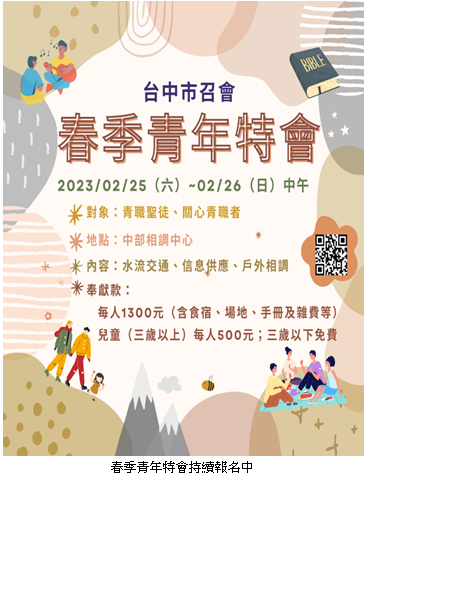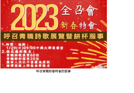 首頁 > 職事信息 > 申言主題 > 全地開展、牧養材料 > 聖經學習單 > 讀經拾穗 > 結晶圖表 > 水流交通 > 專項報導 > 召會生活 > 報告事項 > 禱告事項 > 召會生活人數 專項報導 春季青年特會及呼召新春特會服事 二○二三年二月二十五至二十六日的春季青職特會,因盼望臺中大專聖徒有更多機會和臺中青職聖徒相調,特會將舉辦於中部相調中心,並在部分時段和臺中大專一同聚集。因此春季青職特會更名爲春季青年特會。盼臺中市召會的青年聖徒能燒在一起,奉獻成爲對神有時代價值的青年人。 ![]() 這次青年特會除週六早上兩堂,晚上一堂豐富的信息之外,週六午餐後爲活力交通時間。我們鼓勵各大區或各照顧區的青職聖徒可以一同設計相調行程,多在生活中聯結一起,成爲清心追求主的好同伴。 二月二十六日主日將有擘餅聚會和專題交通,特會結束後,仍有兩天連假時間。我們鼓勵青職聖徒利用難得的連假規劃相調行程。 除了青年特會,一月二十九日全召會新春特會,我們也呼召六十位青職聖徒有分詩歌展覽,和二十位青職聖徒有分餅杯傳遞。盼望在二○二三年的起頭,青職聖徒就在配搭裏多有交通、相調,使我們對召會-基督的身體-滿有感覺,並藉着展覽和服事,見證基督身體的豐富。 爲着近期的各樣的行動,青職組於每週四晚上9:30至10:15召聚各大區青職聖徒線上交通。兩個月下來,週週平均有二十多位青職聖徒上線與會。他們操練不單單顧到自己的需要,而是以神的家爲優先考量,一同學習配搭事奉,也在交通中將蒙恩彼此分享。願主祝福他們,在他們的勞苦中產生出生命的果效。 我們也求主在今年各項的行動中,繼續加強青職聖徒,願意出代價,學習真理、學習事奉、學習傳福音,並作羣羊的榜樣,成爲主轉移時代的憑藉,阿利路亞!