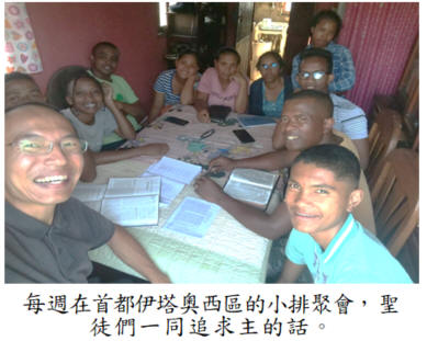 首頁 > 職事信息 > 申言主題 > 全地開展、牧養材料 > 聖經學習單 > 讀經拾穗 > 結晶圖表 > 水流交通 > 專項報導 > 召會生活 > 報告事項 > 禱告事項 > 召會生活人數 全地開展 馬達加斯加一月份開展家書 張弘明弟兄一家開展蒙恩 目前在馬達加斯加有多處城市有開展行動,同時,弟兄們也十分的看重主的見證在首都安塔那那利佛召會的擴增,特別是在首都其中一個區伊塔奧西(Itaosy)。自二〇二三年的下半年在此成立了一個排聚集之後,聖徒人數逐漸穩固及繁增。雖然我們每週在排聚集裏面一起享受主的話,甚至也有些新人被帶進聚集當中,然而,主卻不滿意於此。主給我們感覺,我們的召會生活不單只有「聚會生活」,更需要彼此成為活力同伴,藉着過活力的生活來擔負主的見證。因此,我與一位中壯年弟兄以及一位青職弟兄,我們三人開始團體晨興。一開始我擔心我們會因語言受限制,而影響我們對主的享受,然而,每當我們操練運用我們的靈,開口呼求及禱告,弟兄們的靈就使我的靈活了起來。原來能否產生真實的交通與建造並不在於語言,而是在於我們裏面那內住並調和的靈。藉着每週操練,弟兄們逐漸得復興,甚至讓主在他們的身上作了許多變化的工作。這位中壯年的弟兄,有多年的基督教背景,進到召會生活前也有許多屬靈的追求,他的家中更是陳列許多宗教書籍。曾經有幾位弟兄建議他把這些書處理掉,但當時的他卻面有難色。然而,當他開始過晨晨復興的生活,有一天他居然主動開口跟我們交通:「弟兄們,請你們幫我把這些書都拿去燒掉罷!」這就讓我想起以弗所書四章所說的:「在從前的生活樣式上,脫去了舊人…,而在你們心思的靈裏得以更新。」實在是主的靈在弟兄的身上運行、變化,使他願意脫舊更新,在靈的新樣裏生活行動。願主繼續帶領在伊塔奧西區域的聖徒們,藉着過活力的生活,一同擔負主在這個地方的見證。(未完待續) (張弘明) ![]() 和彼得(二) 一、禱告主的話 可十六7:「你們要去告訴他的門徒和彼得說,他在你們以先往加利利去,在那裏你們要看見他,正如他從前所告訴你們的。」 二、享受職事信息 今天你不愛祂,不親近祂,不回到祂那裏,是很容易的。但是,要祂不愛你,忘記你,棄絕你,卻是作不到。你跌倒了,祂能叫你起來。你雖然好像再也不能親近祂。但是,你若在信心裏記得「和彼得」這句話,你就能親近祂。 當我們要親近主,又好像相距很遠,無力親近主時,我們要記得「和彼得」這句話。主並沒有丟棄彼得,主也沒有丟棄你。「和彼得」的意思也就是「和你」-這個像彼得那樣失敗的「你」。但願我們看見主對我們的心是何等的心。你如果看見了主的心,你就不能不向祂奔跑了。(倪柝聲文集第一輯第十八冊,一一至一五頁)。 三、歡唱詩歌(詩歌補充本321首第二節) 我怎能離開主,怎能將主忘記,當祂愛的泉源,湧流我裏; 將我全人浸透,使我全人復甦,除了主還有誰,使我歸依。 四、為彼此健康、工作、家人代禱 邀請弟兄姊妹加入並分享以下資源 >台中市召會網站(官網含完整資訊) http://www.citc.org.tw/ >台中市召會聖徒交通(社群) http://bit.ly/2TIYeVX >台中市召會網路資訊中心 Youtube頻道 https://bit.ly/3s2y9Sr >台中市召會科園會所 Youtube頻道 https://bit.ly/3ysUECj >水深之處 http://www.luke54.org/ |